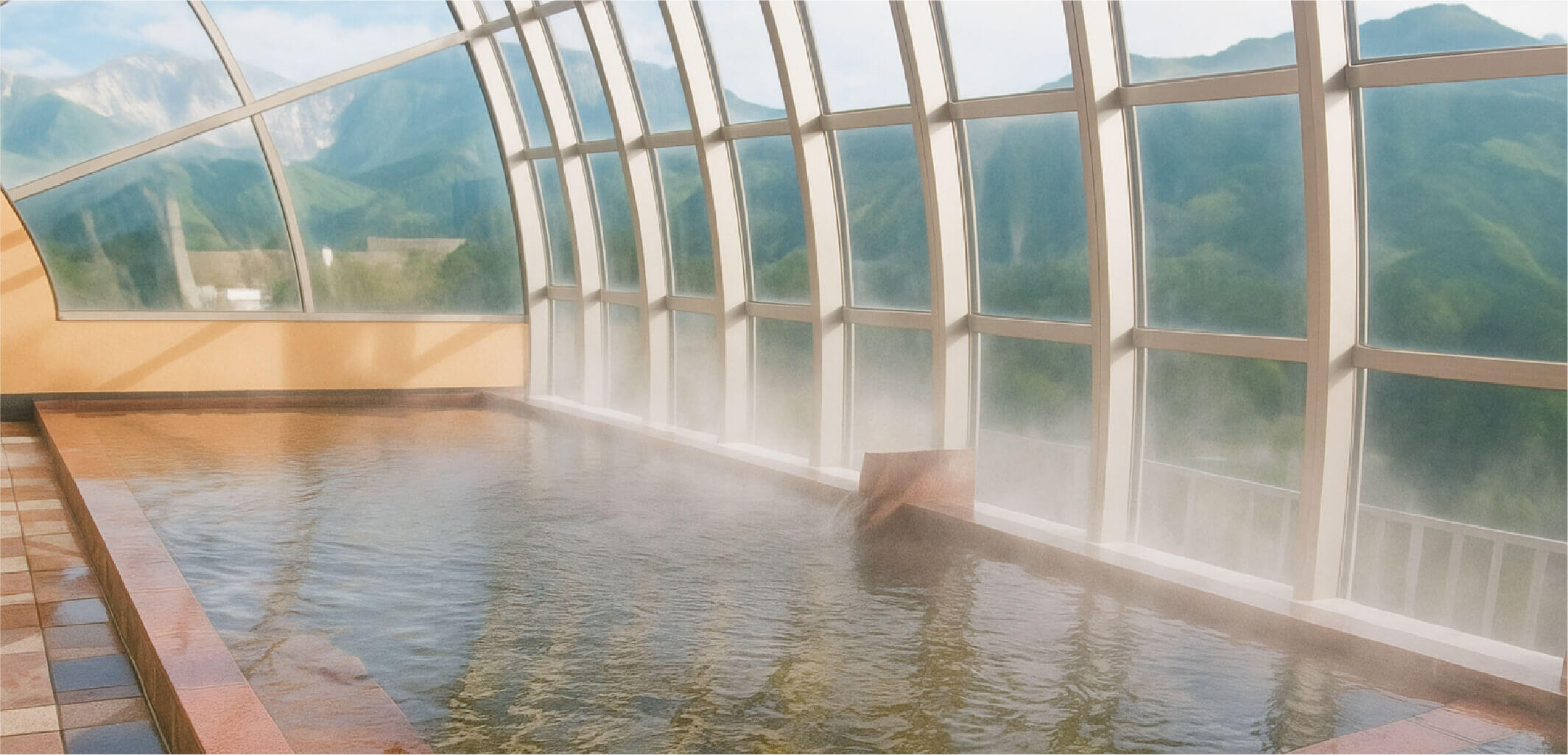 当館の自家源泉を愉しめる大浴場。無色透明でさらりとしたアルカリ性単純温泉が中心。湯冷めしにくく、「美肌の湯」としても知られています。