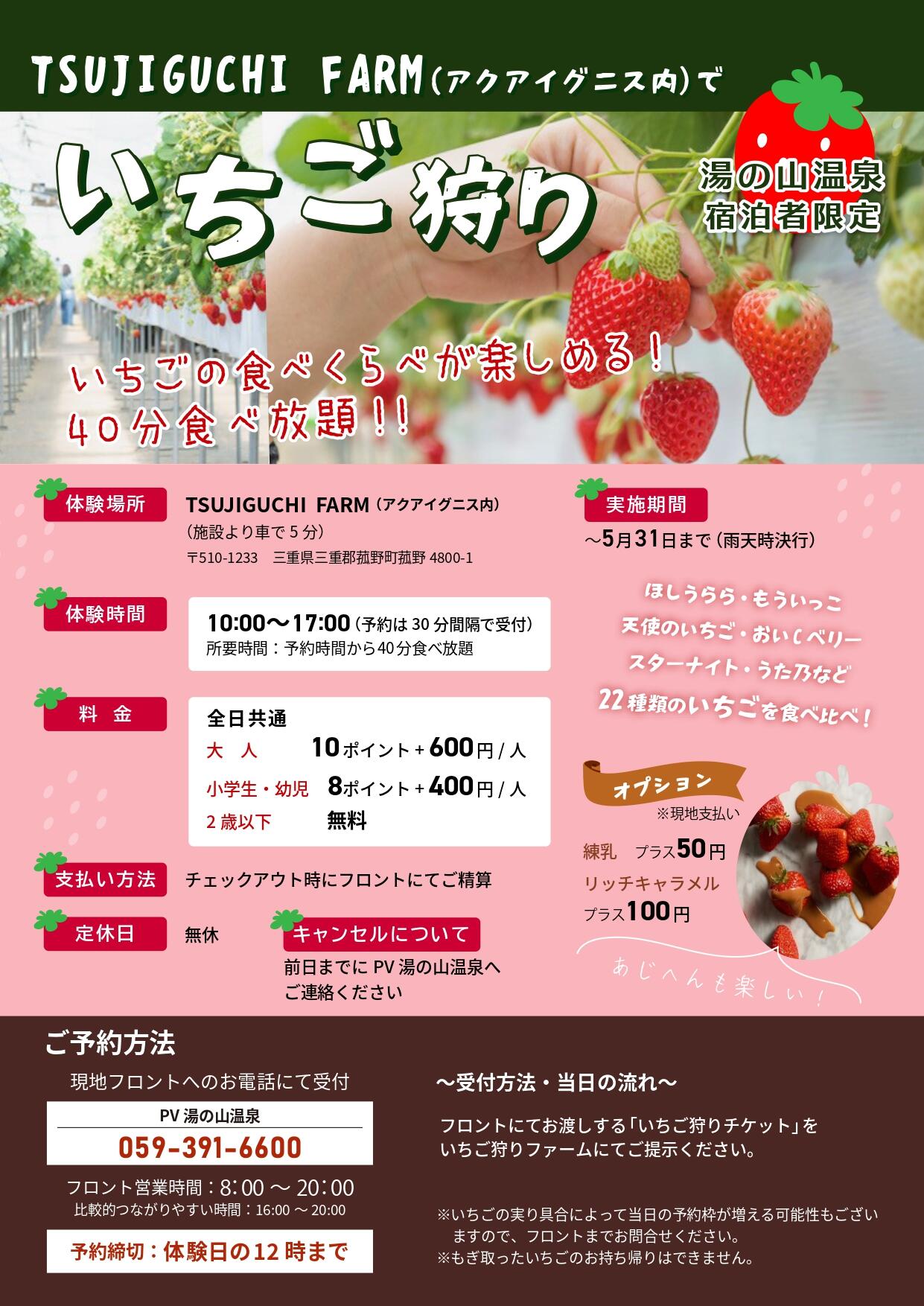 ポイントバケーション湯の山温泉ブログ ブログトップへ 施設ページへ 2026.01.17 いちご狩りイベント始まりました! オーナーの皆さま こんにちは! いちご狩りをポイントde体験できるイベントをご紹介いたします(*'ω'*) ポイントバケーション湯の山温泉より車で約5分のTSUJIGUCHI FARMさん(アクアイグニス内)でいちご狩り体験ができます! 普段はなかなかお目にかかることが出来ない珍しい品種がたくさん楽しめる農園です! 減農薬、有機肥料栽培など、安心でおいしいいちごを湯の山で堪能してみてはいかがでしょうか? お問い合わせはポイントバケーション湯の山温泉フロントまで! 前へ 月別アーカイブ 2026年1月 (2) 2025年12月 (2) 2025年11月 (2) 2025年10月 (1) 2025年9月 (2) 2025年8月 (1) 2025年7月 (1) 2025年6月 (1) 2025年5月 (2) 2025年4月 (2) 2025年3月 (1) 2025年2月 (1) 2025年1月 (1) 2024年11月 (1) 2024年1月 (1) 2023年1月 (1) 2022年11月 (1) 2022年10月 (2) 2022年8月 (1) 2022年7月 (1) 2022年6月 (2) 2022年1月 (1) Category お勧めスポット (5) イベント (4) グルメ (8) サービス (1) ニュース (7) 観光 (2)